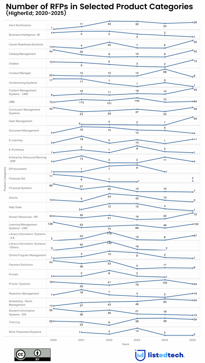 To understand where institutions are truly committing resources, we analyze thousands of RFPs collected annually through the ListEdTech database. Unlike product launches or marketing announcements, RFPs reflect concrete institutional intent, particularly in categories with long procurement cycles such as ERP, SIS, and LMS. As a result, they remain one of the clearest early indicators of where investment decisions are heading.