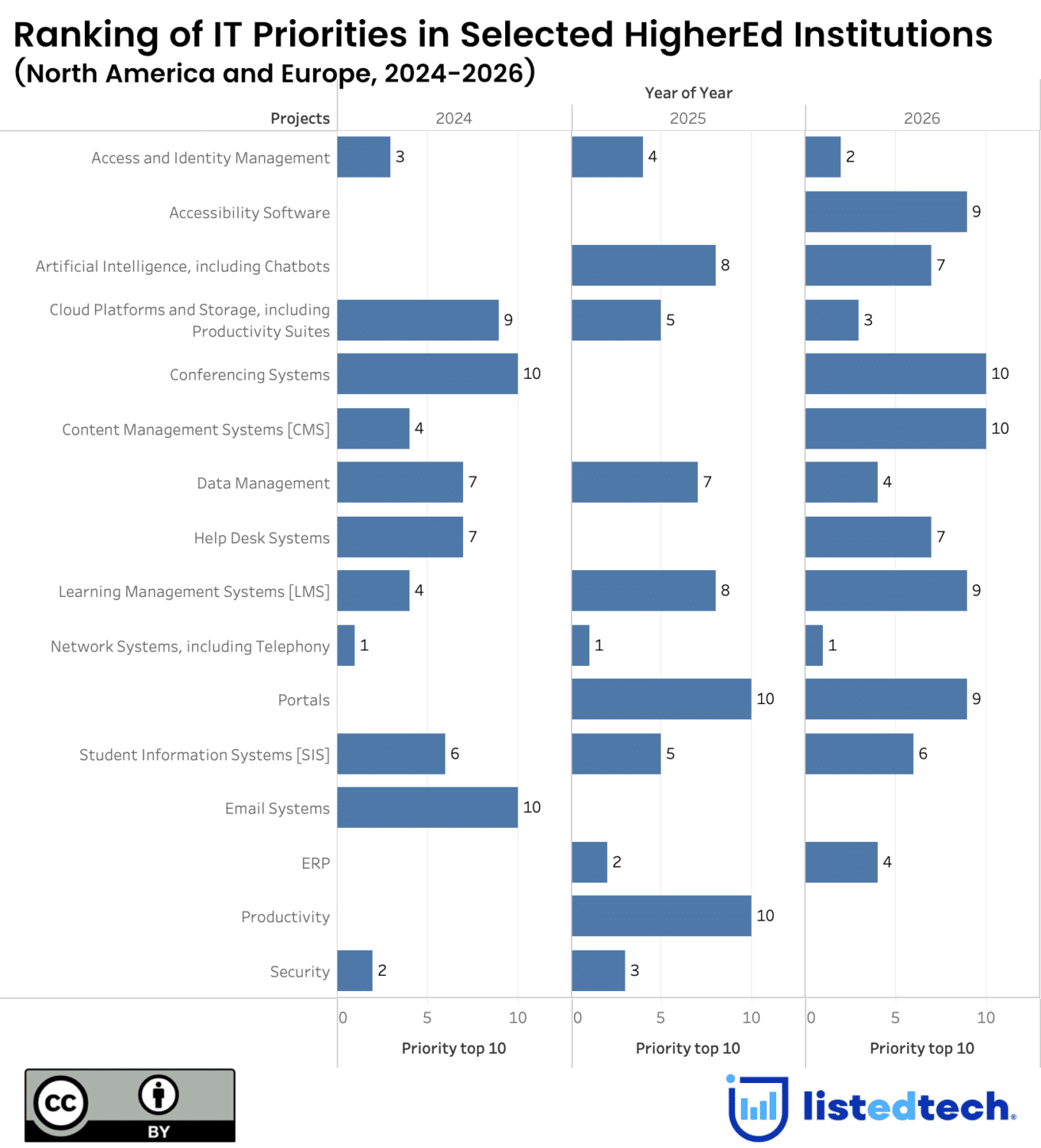 The EDUCAUSE Top 10 article outlines institutional priorities for many universities across North America. While earlier editions primarily focused on IT projects, they also incorporated broader business priorities not always directly tied to IT departments. This year is no exception. Nevertheless, the article remains a useful point of comparison for our analysis.