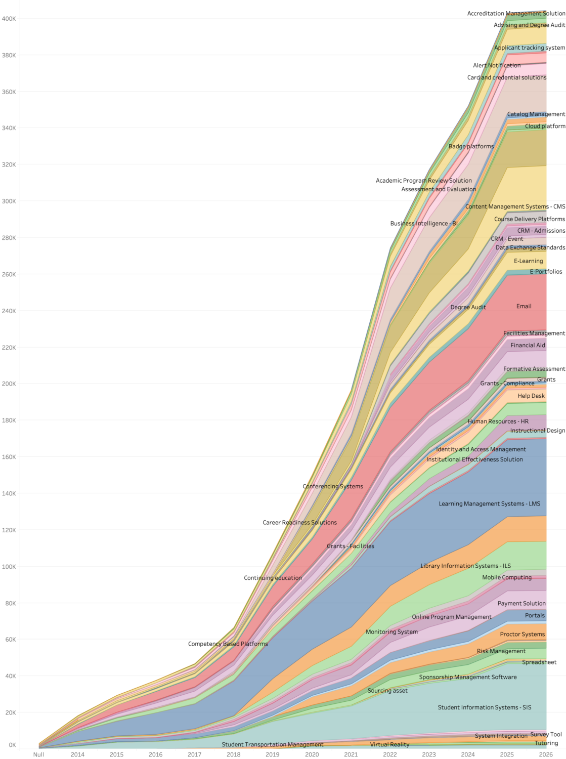 - Broader Category Coverage: While learning management systems dominated early discoveries, other categories such as library management systems, student information systems, and career readiness solutions have seen significant additions since 2019.